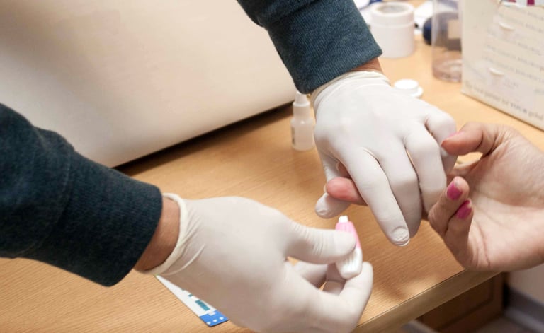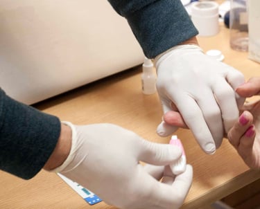 Se extraen unas gotas de sangre de la yema de un dedo y se la deposita sobre una tira reactiva.